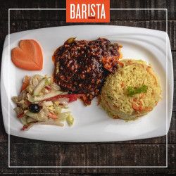 Roshi mixed with vegetables and spices with choice of chicken. tuna or smoked tuna