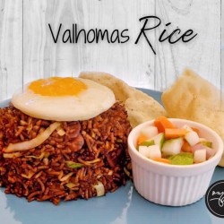 Oxygen special prawns, served with a bowl of vegetable rice and mixed salad