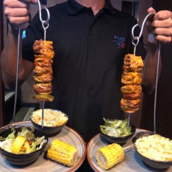 Boneless chicken, peppers, mushrooms, onion on skewers served with rice and baby green salad
